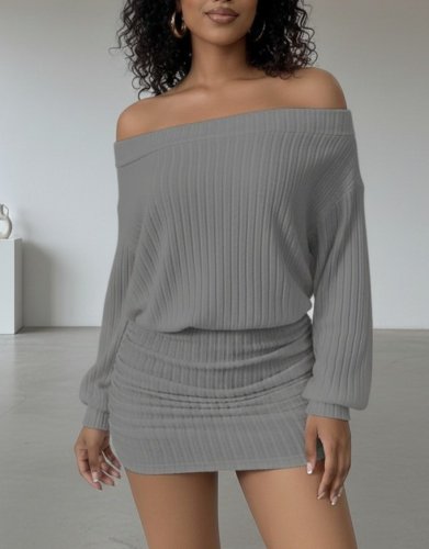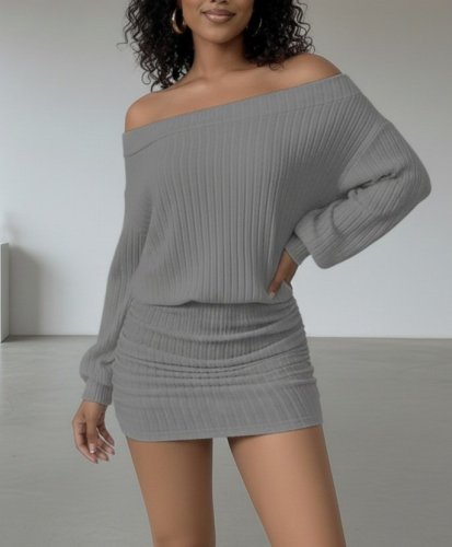 • Kadın uzun kollu madonna yaka yanlardan büzgülü şardonlu kaşkorse mini elbise