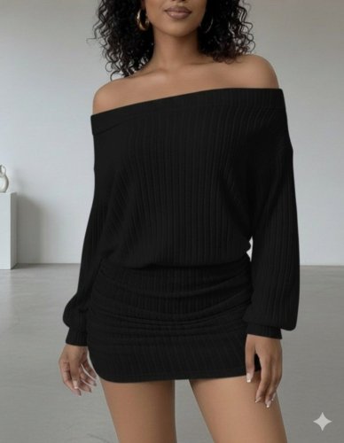 • Kadın uzun kollu madonna yaka yanlardan büzgülü şardonlu kaşkorse mini elbise
